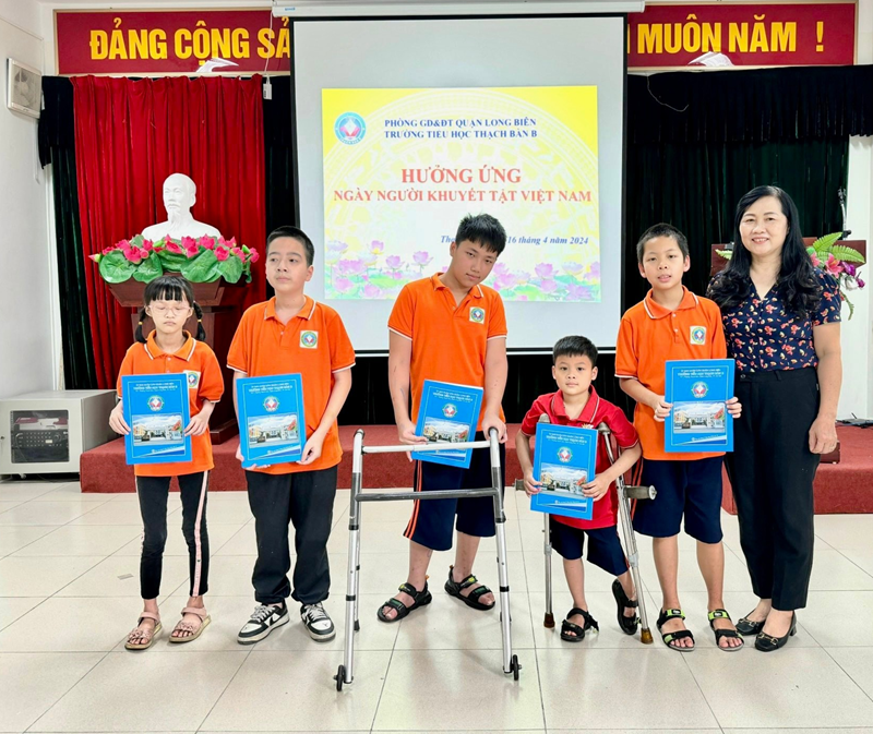 Nhằm chia sẻ, động viên các thiếu nhi khuyết tật vượt qua những khó khăn, mặc cảm của bản thân, tự tin hòa nhập cuộc sống và thiết thực hưởng ứng “Ngày người khuyết tật Việt Nam 18/4”, chiều ngày 16/4/2024 trường Tiểu học Thạch Bàn B đã tổ chức trao quà cho các em học sinh khuyết tật của trường, mỗi suất quà trị giá 200.000đ. Đại diện nhà trường cô giáo Nguyễn Thị Thu Hương- Bí thư chi bộ, Hiêu trưởng nhà trường đã trao quà cho các em. Các học sinh được nhận quà là: Nguyễn Hải Nam lớp 2A5, Lê Ngọc Dung lớp 4A1, Nguyễn Đức Thắng lớp 4A6, Mai Anh Việt lớp 5A3, Nguyễn Xuân Lực 5A4. Ngoài ra cô giáo Hiệu trưởng còn tặng riêng cho mỗi em một phần quà trị giá 300.000đ.