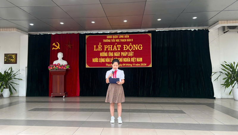 Cách đây 78 năm ngày 09 tháng 11 năm 1946 đã trở thành lịch sử, ngày đánh dấu mốc son trong lịch sử lập pháp của Việt Nam - đây chính là ngày mà Quốc hội nước Việt Nam dân chủ cộng hòa ban hành bản Hiến pháp năm 1946 – đạo luật cơ bản đầu tiên, một “tài sản” đặc biệt của Nhà nước ta. Thực hiện công văn số 224/PGD&ĐT ngày 28/10/2024 của Phòng GD và ĐT quận Long Biên về việc tổ chức hưởng ứng “Ngày pháp luật nước cộng hòa XHCN Việt Nam” trong ngành giáo dục và đào tạo năm 2024, sáng ngày 04/11/2024, trường Tiểu học Thạch Bàn B đã long trọng tổ chức Hưởng ứng ngày Pháp luật nước CHXHCN Việt Nam (09/11/2013 – 09/11/2024).