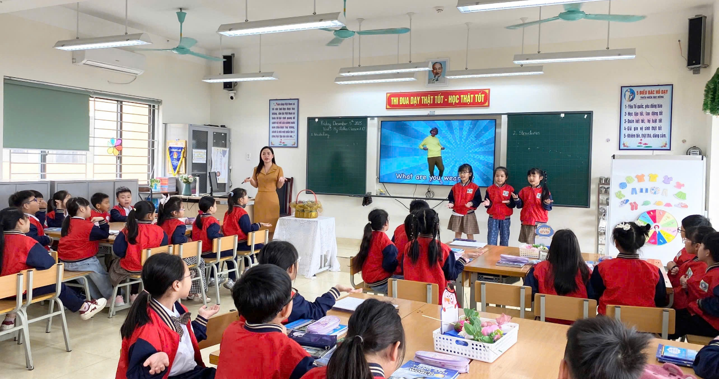 Tiết học được thiết kế khoa học, bám sát mục tiêu chương trình và phát huy tối đa năng lực giao tiếp của học sinh. Ngay từ phần khởi động, học sinh được tham gia bài hát “Clothes Song” kết hợp vận động và trò chơi “Color Step Game”, tạo không khí học tập sôi nổi, giúp các em nhanh chóng tập trung và hứng thú với bài học.