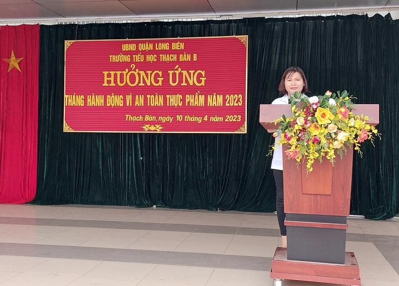 Thực hiện Kế hoạch số 188 ngày 31 tháng 03 năm 2023 của UBND Quận Long Biên về việc triển khai “Tháng hành động vì an toàn thực phẩm” năm 2023 sáng ngày 10/4/2023, trường Tiểu học Thạch Bàn B đã tổ chức tuyên truyền hưởng ứng cho học sinh và cán bộ giáo viên nhân viên trong nhà trường về nguyên nhân dẫn đến ngộ độc thực phẩm và các biện pháp đảm bảo an toàn thực phẩm. Bài tuyên truyền cho thấy tầm quan trọng của việc đảm bảo vệ sinh ăn uống và đưa ra các nguyên tắc vàng về vệ sinh an toàn thực phẩm để đảm bảo sức khỏe cho bản thân và gia đình. Buổi tuyên truyền diễn ra hết sức sôi nổi, hào hứng. Học sinh chú ý lắng nghe và tham gia trả lời đúng các câu hỏi như: Nguyên nhân chủ yếu dẫn đến ngộ độc thực phẩm? Những nơi có nguy cơ cao dễ xảy ra mất vệ sinh an toàn thực phẩm? Có mấy nguyên tắc vàng về vệ sinh an toàn thực phẩm? Khi phát hiện hoặc nghi ngờ ngộ độc thực phẩm chúng ta phải làm gì?...