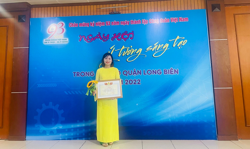 Cô Mai Thị Oanh nhận giấy khen trong Ngày hội “Ý tưởng sáng tạo” cấp Quận