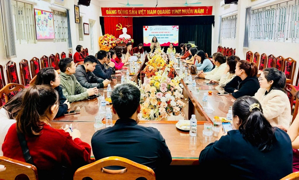 Hội nghị Ban đại diện cha mẹ học sinh các lớp diễn ra ngày 14/1 trong không khí nghiêm túc, trách nhiệm và xây dựng. Tại phòng Hội đồng, thay mặt Ban giám hiệu, cô giáo Phạm Thị Tuyến, Bí thư Chi bộ, Hiệu trưởng nhà trường đã báo cáo các kết quả đạt được của Nhà trường trong học kì 1 và đề ra những nhiệm vụ, phương hướng của học kì 2, năm học 2025-2026. Nhà trường đã nhận được sự ủng hộ, nhất trí của các đại diện Phụ huynh, đồng thời được lắng nghe những ý kiến chia sẻ và bày tỏ nguyện vọng sẽ luôn đồng hành cùng với nhà trường trong mọi hoạt động, giúp nhà trường thực hiện thắng lợi các chỉ tiêu đề ra trong học kì 2. Các bậc phụ huynh đã tích cực trao đổi, thẳng thắn đóng góp nhiều ý kiến thiết thực, tập trung vào việc nâng cao hiệu quả phối hợp giữa gia đình và nhà trường trong quản lý, giáo dục và hỗ trợ học sinh. Hội nghị cũng thống nhất cao trong việc kiện toàn Ban đại diện cha mẹ học sinh các lớp, thể hiện rõ tinh thần đồng hành, trách nhiệm và quyết tâm cùng nhà trường xây dựng môi trường giáo dục chất lượng, thân thiện và phát triển toàn diện cho học sinh.