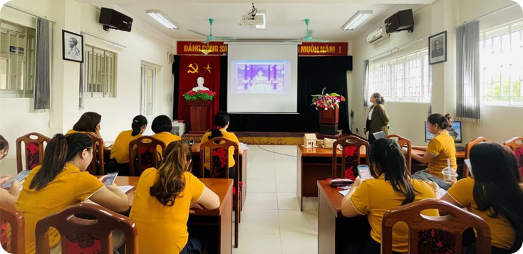 Tham gia buổi tập huấn, có đại diện bên Công ty CP Giáo dục STEM+ và BGH nhà trường cùng các thầy cô giáo giảng dạy trong nhà trường. Không khí của buổi tập huấn diễn ra vui tươi và đầy hứng khởi. Cán bộ, giáo viên trong nhà trường được đại diện bên STEM giới thiệu về ý nghĩa tên gọi, quan điểm cốt lõi của chương trình, các hoạt động, nội dung đặc sắc của các bài học.