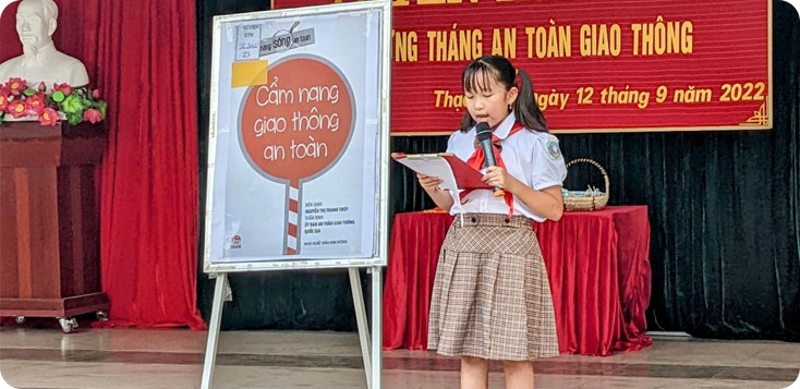 Các em học sinh tích cực trả lời câu hỏi để giành được những phần quà của chương trình. Tiếp nối chương trình là phần giới thiệu cuốn sách “Cẩm nang giao thông an toàn”, của tác giả Nguyễn Thị Thanh Thủy, qua phần thể hiện của em Đỗ Ngọc Linh Đan – lớp 5A1. Đội văn nghệ còn thể hiện những tiết mục văn nghệ đặc sắc làm phong phú thêm nội dung chương trình. Đây là một hoạt động giáo dục kỹ năng có ý nghĩa, chính các em sẽ là những tuyên truyền viên nhí, truyền đạt những kiến thức giao thông tới người thân nhằm nâng cao hiểu biết và ý thức văn hóa giao thông của mọi người.